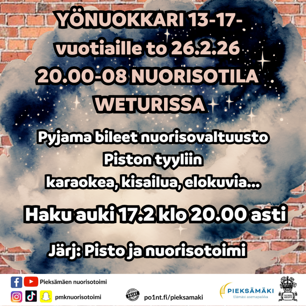 Nuorisovaltuusto Pisto ja nuorisotoimi järjestävät hiihtolomalla yönuokkarin 13-17-vuotiaille torstaista 26.2. perjantaihin 27.2. Mukaan mahtuu 25 osallistujaa ja vähimmäismäärä on 20.
